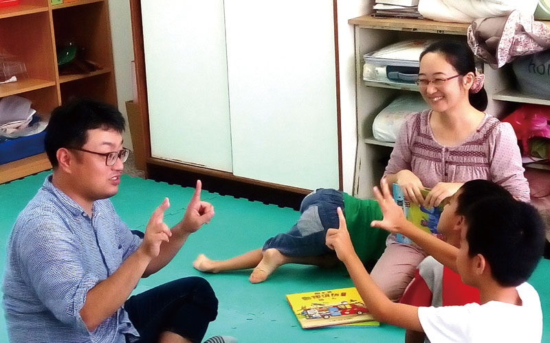 ▲本文作者(右)與創立「人間」的宮田隼到台東縣富山國小與一年級學生交流。(攝影/王常怡)