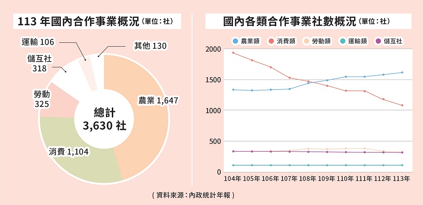 註:❶圖表所稱「農業」係農業類合作社、合作農場、專營合作社聯合社之合計 ❷圖表所稱「消費」係消費合作社、公⽤合作社之合計 ❸圖表所稱「勞動」係⼯業勞動合作社、原住⺠勞動合作社之合計