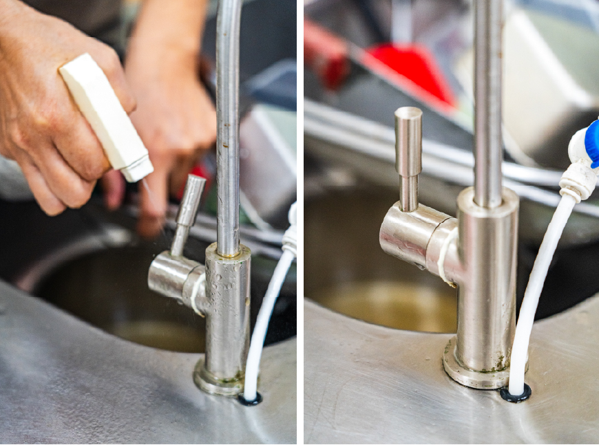子姍老師與她的先生,在居家清潔很愛用「綠主張生態多功能清潔劑」,平日煮完餐食,用稀釋過的「多功能清潔劑」(建議比例是1:20),在鍋具、瓦斯爐台、排油煙機、水槽、抹布噴灑靜置數分鐘,即能輕鬆去油去汙。也可以對付惱人的果蠅、螞蟻與蟑螂。