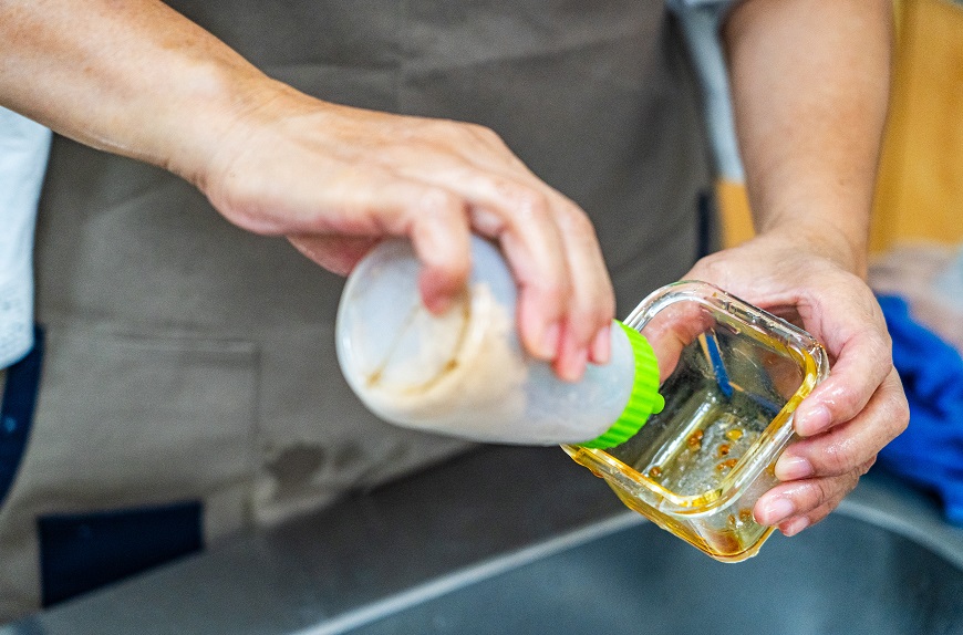 年節拜拜總少不了象徵步步高升的糕點,雖然從在來米開始製作的味道最讚,但是耗時費工,子姍老師說使用銀川在來米粉不只方便、節省時間,做出來的口感也跟泡米的方式接近,適合要製作蘿蔔糕的人。她還提到製作芋頭糕並不困難,甚至可以全程使用電鍋製作。趁生鮮芋頭盛產時,一次削皮、處理切好芋頭成小長方塊狀後冷凍起來,想吃的時候用電鍋蒸軟,再倒入合作社的油蔥醬、干貝醬拌勻,接著以在來米粉和地瓜粉混合的粉漿調勻拌至呈黏稠狀,再一次放進電鍋蒸熟,就快速完成了,手邊若有滷肉燥也可加入。如果要吃素蘿蔔糕,子姍老師補充除了香菇,也可放油炸豆包、乾炒過的杏鮑菇、紅蘿蔔等等。若想嚐嚐不一樣的風味,不妨用大頭菜、青木瓜來製作看看喔!