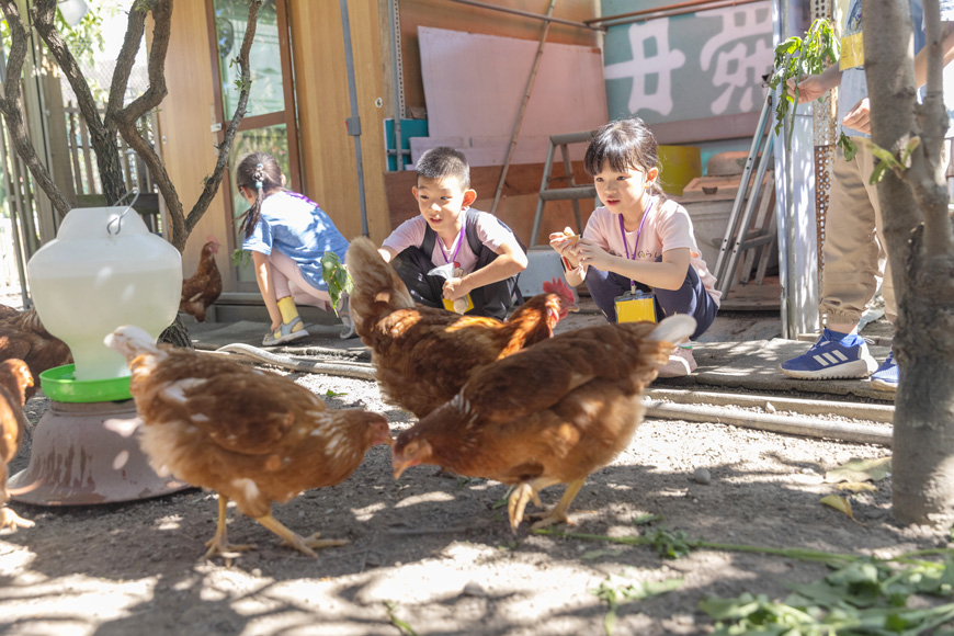 在此承租菜園種菜的三鶯站社員曾瑞敏,是本次活動的推手。有感於小孫女吃過雞蛋但卻沒看過雞走路,與她小時候聽著雞鳴起床、被媽媽囑咐去撿雞蛋的生活經驗相去甚遠,因此希望都會區的小孩也能體會這樣的情景。過去在蒙特梭利幼兒園工作的她,深知小孩單獨玩不好玩,一群孩子才熱鬧,再加上她很看重在實地體驗中學習的效果,認為食農教育的核心,就是要孩子親身經歷、看到、摸到、玩到,因此大力促成三鶯站這次的綠食育活動。農長主人讓小朋友餵雞吃空心菜、麵包,還有芭樂,小朋友看到雞隻啄食青菜時大喊:「哇哇哇!牠吃了牠吃了!」興奮的神情讓大人們也很開心。而且孩子們雖年紀尚小,卻能牢記彭爺爺的叮嚀,彼此提醒:「麵包要撥小小塊,不然雞會被噎到。」還有孩子餵雞吃菜時, 因為擔心手被啄到而直接把菜拋進雞舍,「我怕被咬到會痛,但如果真的被啄到也沒關係,因為雞也不是故意的。」孩子愛動物的天性不言而喻。