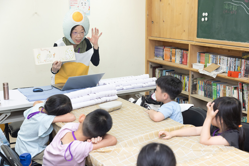 三鶯站站務林明惠以《我的寶貝蛋》繪本向孩子解說雞蛋是如何形成的。由於才經歷了在雞舍最前線與小雞、公雞、母雞的親密接觸,孩子們對於雞的生活場域和生長過程已有基本認識,此時再以繪本加強孩子的認知,會讓小朋友對於蛋品有更進一步、具體的了解。明惠表示,在活動設計階段,地區營運夥伴去圖書館借閱雞蛋相關主題繪本時,考量到本次活動參與的小朋友年齡層較低,所以挑選淺顯易懂的內容,果然成功引起孩子們的興趣。