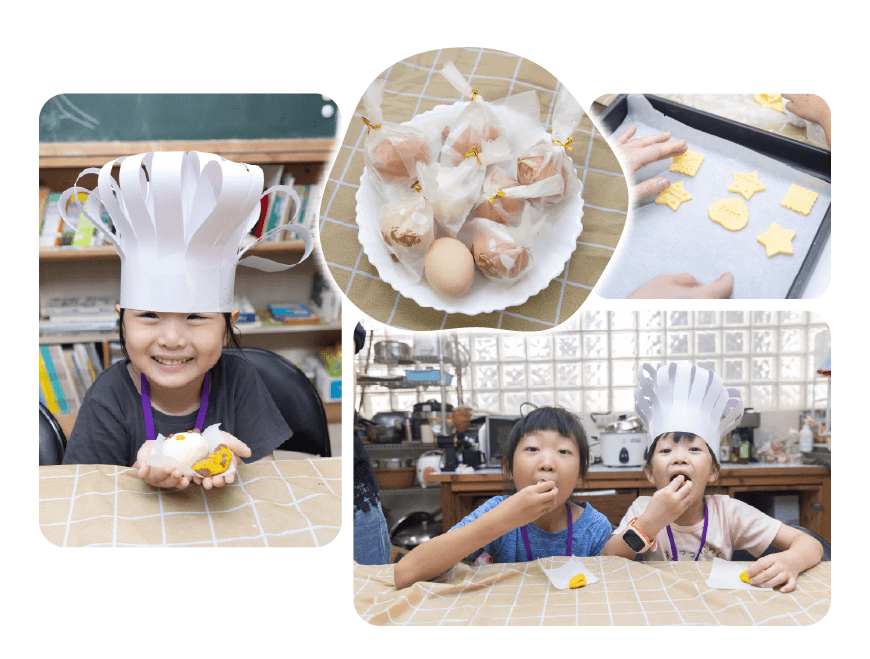 當日站所以蛋入菜做出多道佳餚,二年級的邱嘉恩分享刨成細絲炒蛋的紅蘿蔔:甜甜的蠻好吃的,但也坦言:「雖然還是不太喜歡胡蘿蔔,但我知道不挑食才會健康。」榮登孩子們最愛的料理是手工餅乾,嘉恩說:「我們自己做的餅乾,裡面只有麵粉、奶油、雞蛋、糖, 跟買的不一樣。」沒想到小朋友們都知道市售餅乾有許多食品添加物,看來從日常生活中接觸健康議題的小朋友,理解的知識還不少呢!
