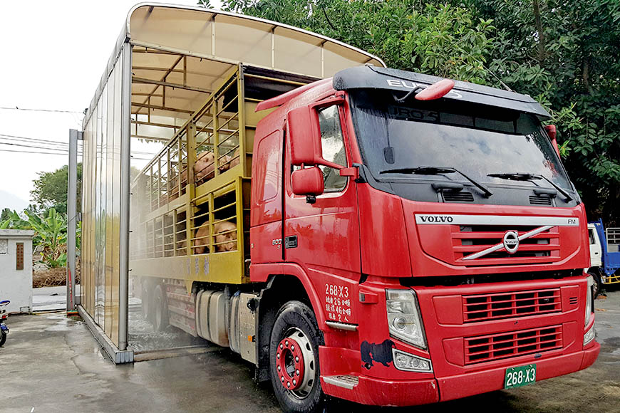消毒進出畜牧場車輛向來是必要的程序,信功內銷業務劉梓岑說,過去會檢視牧場運豬車提具的消毒資料,近日則再口頭提醒務必確實執行。而維持畜舍環境的衛生也是生產者例行的工作,為了防範非洲豬瘟,中央畜牧場將每週1次的全場大消毒增加為2次;也將飼料中可能造成防疫漏洞的肉骨粉從飼料原料、保健添加劑剔除,並禁用來自疫區的添加劑。