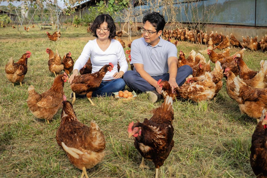牧場運用風扇維持通風,利用太陽能板隔熱並輔以噴霧降溫;引進歐規高床產蛋箱,降低地蛋率避免雞糞汙染。母雞在產蛋之餘,就到樹林間自在地沙浴、曬太陽。此外,堅持不強迫換羽、全程不用藥,他們深信環境好蛋就好。