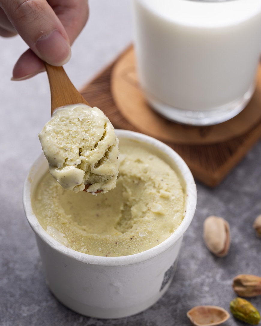 蓁 說個小秘密,其實原本沒有想把這個品項當作預購呢!只是沒想到在會議中大家許願想要多樣性的冰品,因此我才把這品項放入預購提案之中。在多種試吃回饋後,請生產者「玉米三巷」以指定牛奶取代了水、增加開心果量、加入海鹽來進行味道的調整,才促成了目前的風味。