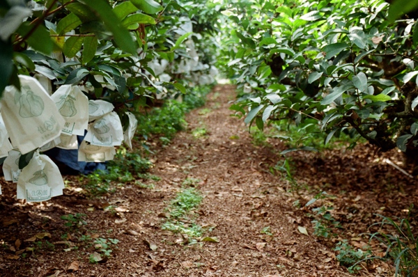 剛進入採收第一期,農園的夥伴正倚著鋁梯將套袋的蓮霧一一採收下來,原本預期看到豐收的盛況,低頭時卻見滿地的落果,因為前陣子寒流剛過,溫度低於十三度,造成許多落果,而果實過軟也不能出貨,採收的大姐只好把它們直接回歸土地,雖然無奈,但為了品質也僅能這麼處理。大姐熱情的分享這稍軟卻滋味甜美的果實,吃在口中感觸無限。