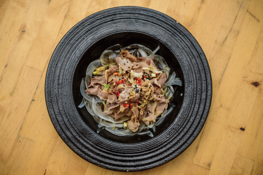 4 盤底鋪上洋蔥絲,擺上羊肉片,淋上醬汁,灑上芝麻粉即可。