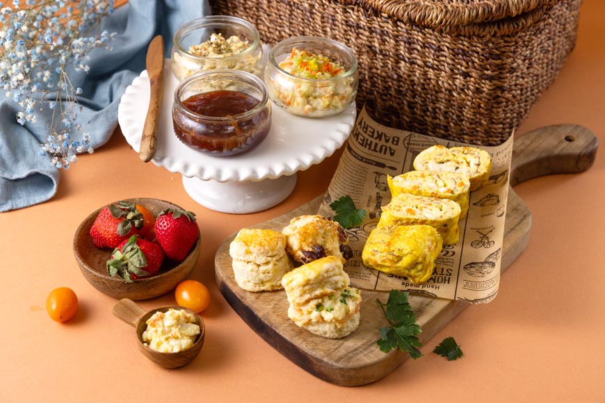 甚少購買市售甜食的彩嫺,會用這道有著酥脆外殼與鬆軟口感的司康,滿足孩子想吃點心的時刻,用不同抹醬即可轉換口味、變化十足。時間有限時,可以快速上桌的義式起司蛋捲是忙碌媽媽的秘密武器。這兩款點心都加入營養價值高的乳製品,而雞蛋所呈現的濃郁香氣更是無可取代。