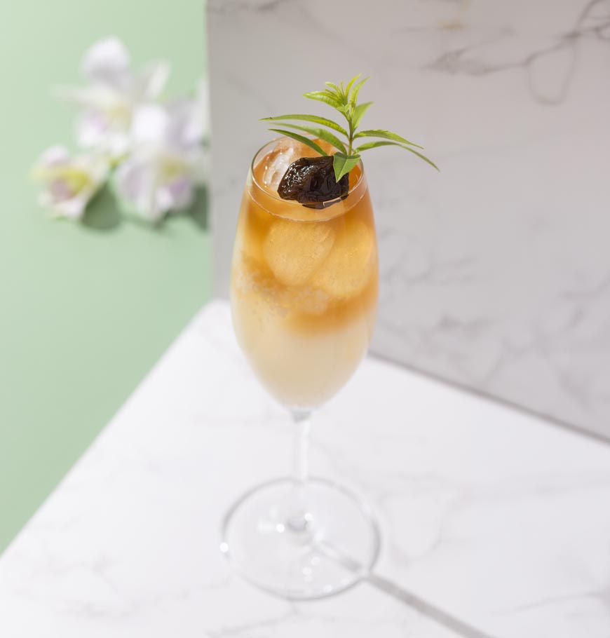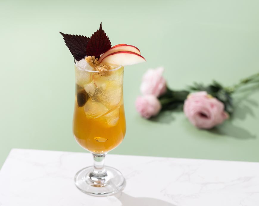 菊花清茶與蘋果的琥珀色澤,搭配紫蘇梅果凍,清麗爽口的滋味,在春光中展現最動人的姿態。