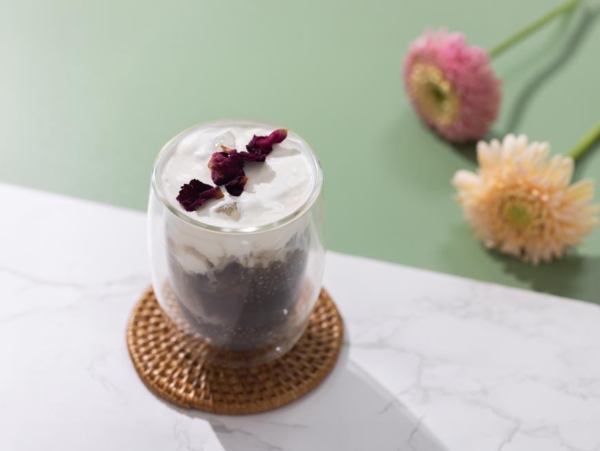 深色仙草加奇亞籽與鮮奶油的流動感,彷彿走入墨色般的文藝幻境,體驗一場東方草本的視覺饗宴。