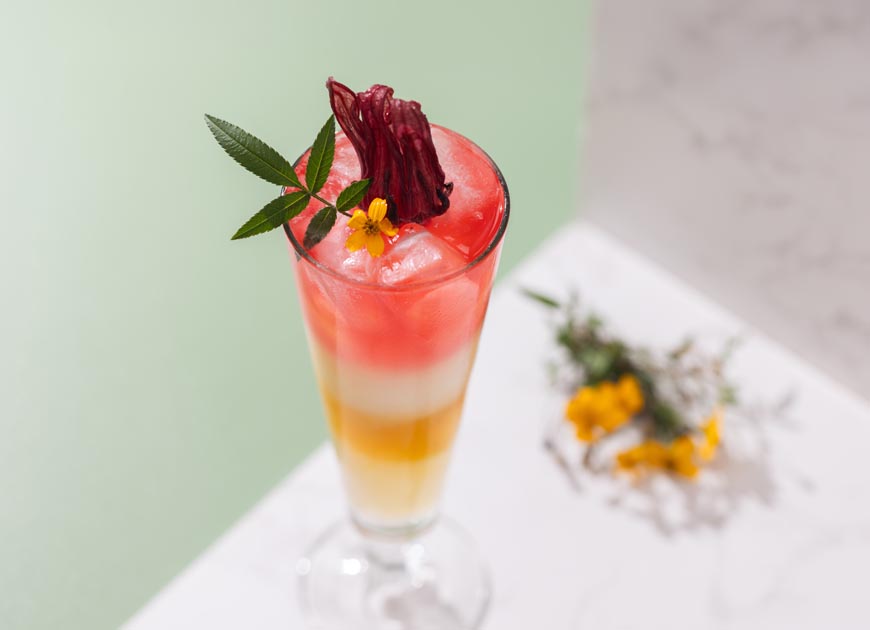 洛神緋紅與芒果汁混合乳清氣泡飲的溫柔撞色,像春日暖陽般的熱情,讓您在人群中神采奕奕。