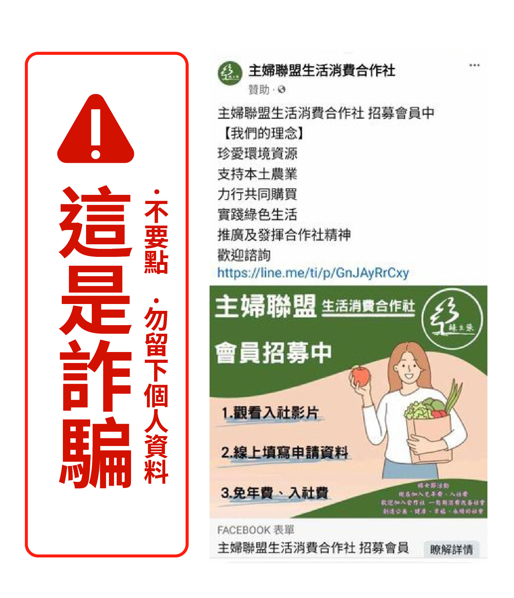 最近接獲民眾私訊反映,詐騙集團使用主婦聯盟合作社的名稱及圖像,在臉書及line群利用「免繳交股金、年費」的方式誘使民眾點擊連結入社,藉此竊取個資。