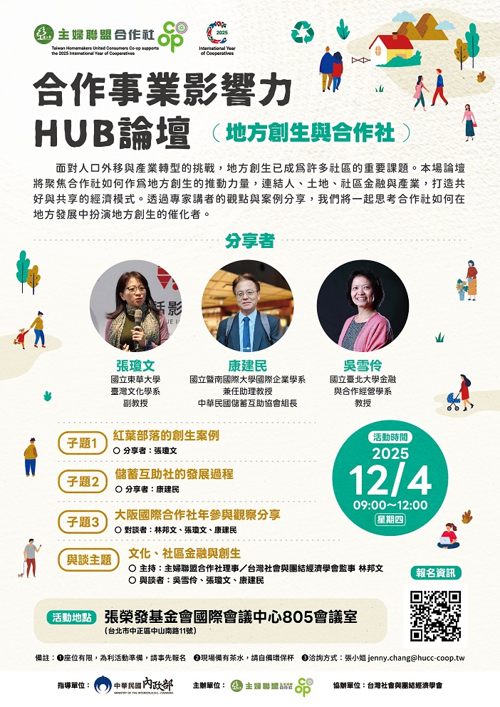 透過來自文化研究、社區金融與合作事業領域的專家分享,讓我們一起看見合作社如何成為地方創生的關鍵推手與重要催化者。