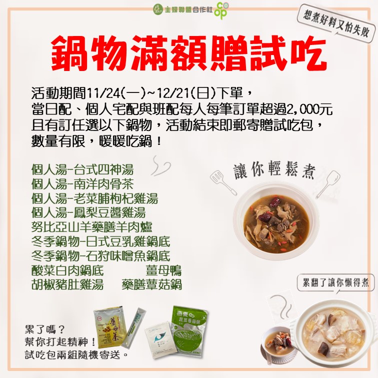 堅持減去不必要的添加,冬季給家人的每一鍋,每碗都像親手熬的一樣安心。活動時間:11/24(一)~12/21(日)下單(以訂單日期為主)