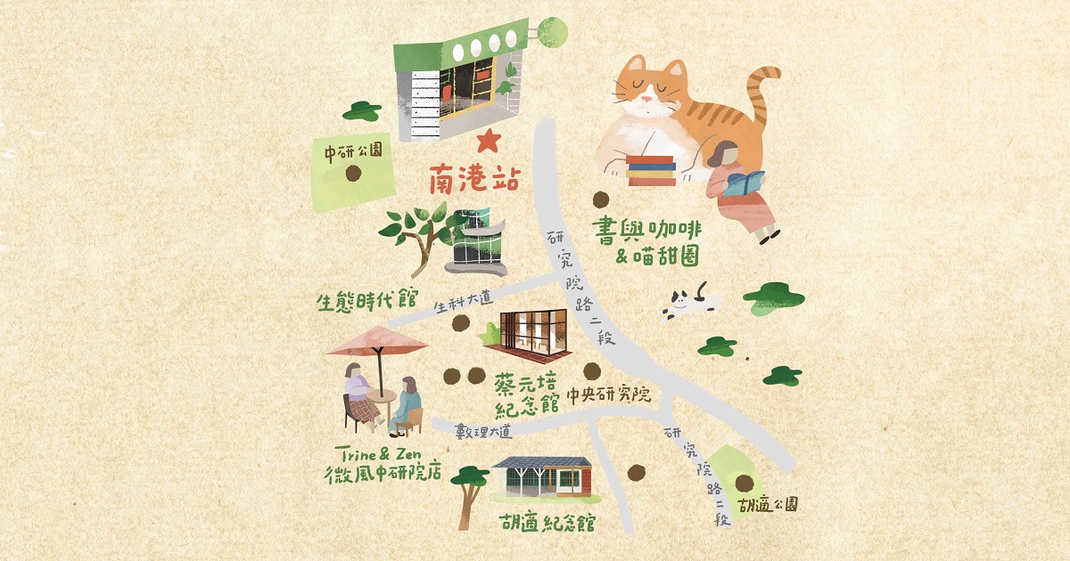 如果逛一逛覺得累了想找地方歇腳,蔡元培紀念館旁的「Trine&zen崔妮傑恩」可以喝咖啡、吃早午餐,Trine&zen 的空間不大,但是有戶外區可以坐,拍照打卡很漂亮。位於研究院路二段的「書與咖啡」也有咖啡與點心可以吃,還有二隻店貓陪你玩。當然,直接到我們的南港站所買瓶芒果汁或仙草甘茶喝也很解渴,喝完再到旁邊護漁有成且綠化成功的四分溪走走,就是完美的一日遊。