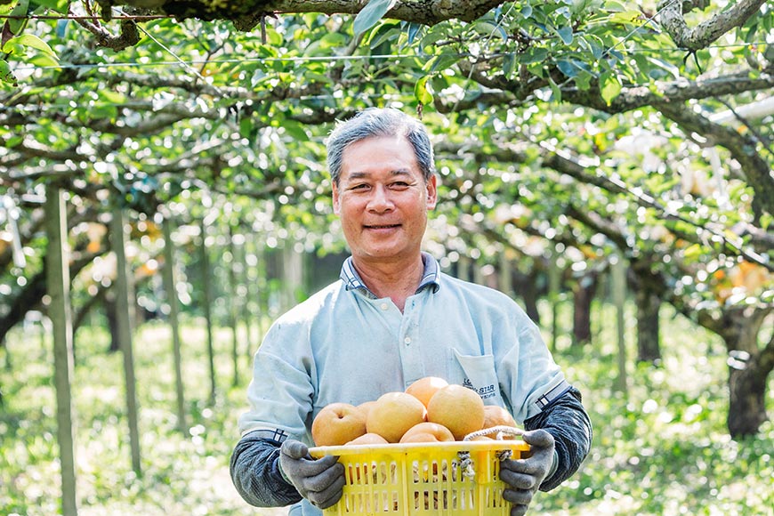 祖傳的梨園傳到四十六年次的孫昌楙已是第四代,面積約九分地,主要生產豐水梨和新興梨。孫昌楙說:「我不做催熟、不做葉面施肥,也不用勃激素(GA),所以需要更長時間熟成,風味自然不一樣,我的梨子吃得到陽光味喔!」他對環境的照顧和梨子一樣無微不至,堅持與草木共生,從除草劑減量到完全停用,花了十一年時間,期間更砍除位於山坡地上兩公頃面積的梨樹,植樹造林。