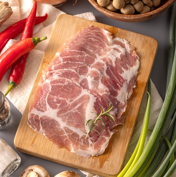 | 調理方式 | 位於豬的上肩處,可以品嚐到瘦肉與油花交疊一起的綿密口感! 薄切2mm火鍋片,適合涮鍋、拌炒、煎烤等料理方式。 |