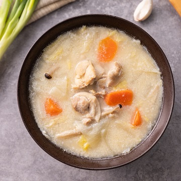 | 內容物 | 水、發芽黃豆漿*[水、有機黃豆(美國非基因改造)、有機糖(巴西)]、雞腿肉、白菜、洋蔥、紅蘿蔔、鴻喜菇、非基因改造大豆味噌(非基因改造黃豆、米、水、鹽)、非基因改造芥花油、鰹魚鹽麴[鹽、玉米澱粉、葡萄糖、乳糖、酵母抽出物、鰹魚粉、塩麴(米、鹽、糖、海水礦物質濃縮液)]、太白粉、鹽、酵母抽出物 |