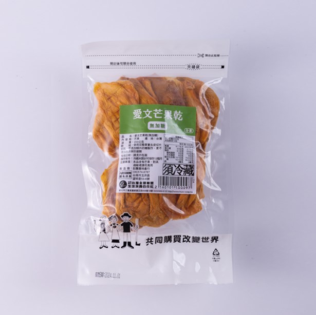 生產者為鈺豐農特產行,使用甜度14度以上、新鮮成熟愛文芒果,削皮取果肉後,製造過程不添加蔗糖調味,直接乾燥加工,保留天然芒果香與甜味,不添加色素與防腐劑。