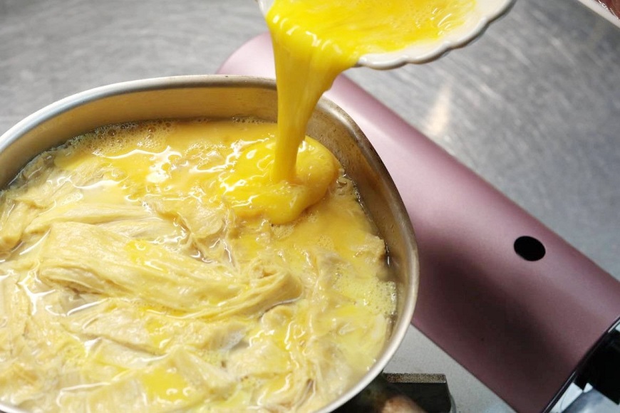 4. 清水加紅冰糖煮滾,放入湯圓煮至浮起,接著放入生豆包條,水再度煮滾後,繞著鍋子下一圈蛋汁後關火。 |