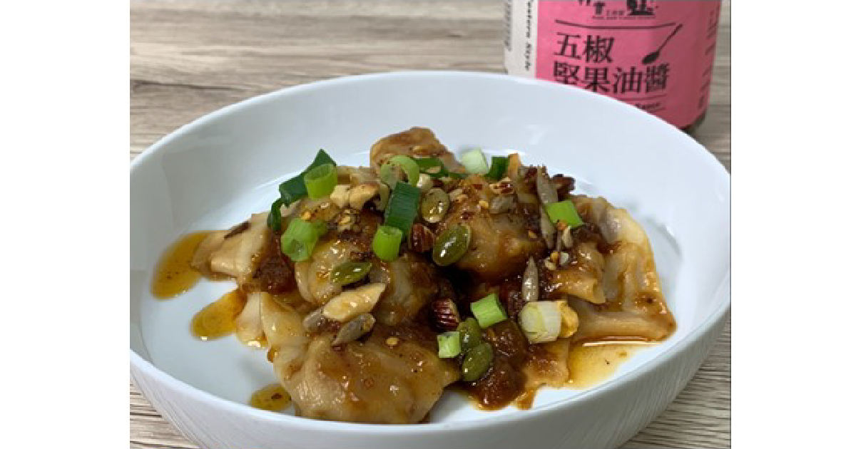 五椒堅果油醬、餛飩、花生醬、烏醋、醬油、味醂、蔥花