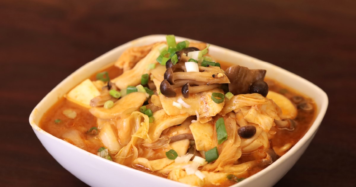 3. 洋蔥炒香,與高麗菜、菇類、豆腐,放入魚高湯中,調入味噌辣醬、蒜辣椒燉煮,以鹽巴調味。