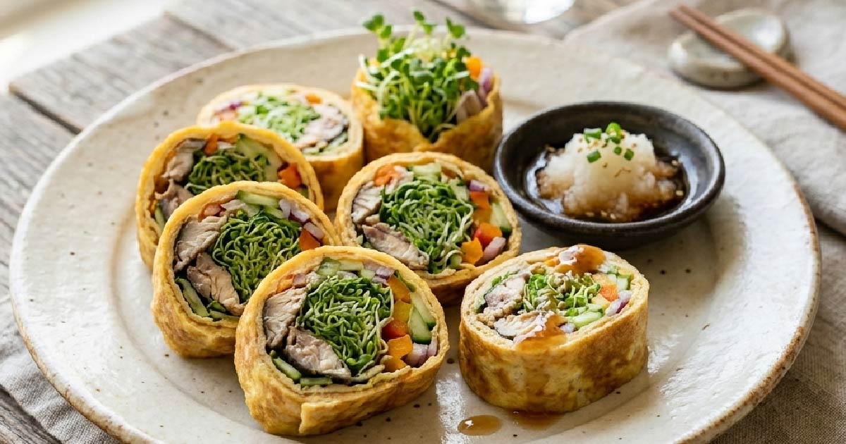 金黃蛋皮包裹秋刀魚與當季蔬果,魚肉鮮香搭配三日苗的清脆與微辛,口感層次分明;淋上白蘿蔔泥與醬油、米醋(或少許梅醋)調成的清爽醬汁,使整體風味更輕盈不膩。秋刀魚提供蛋白質與魚類脂質來源,搭配芽苗與蔬果增加蔬菜比例與多元植物營養,讓這道蛋捲在美味與均衡間取得平衡。