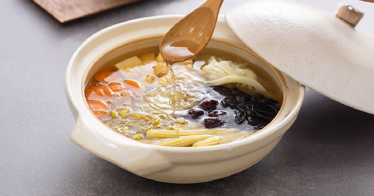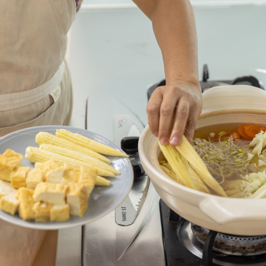 3. 熬成的湯底加入適量的醬油及胡椒,並將準備的蔬菜放入燉煮,約10分鐘後即完成。 |