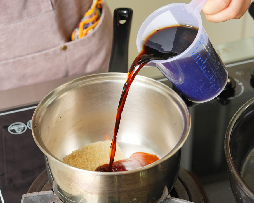 1. 先製作關東式壽喜燒醬汁。拿一小鍋放入30g 糖、100ml 料理用米酒、100ml醇米霖、100ml醬油,小火攪拌溶解,煮至沸騰冒泡、酒精揮發後熄火,放置旁邊降溫。 |