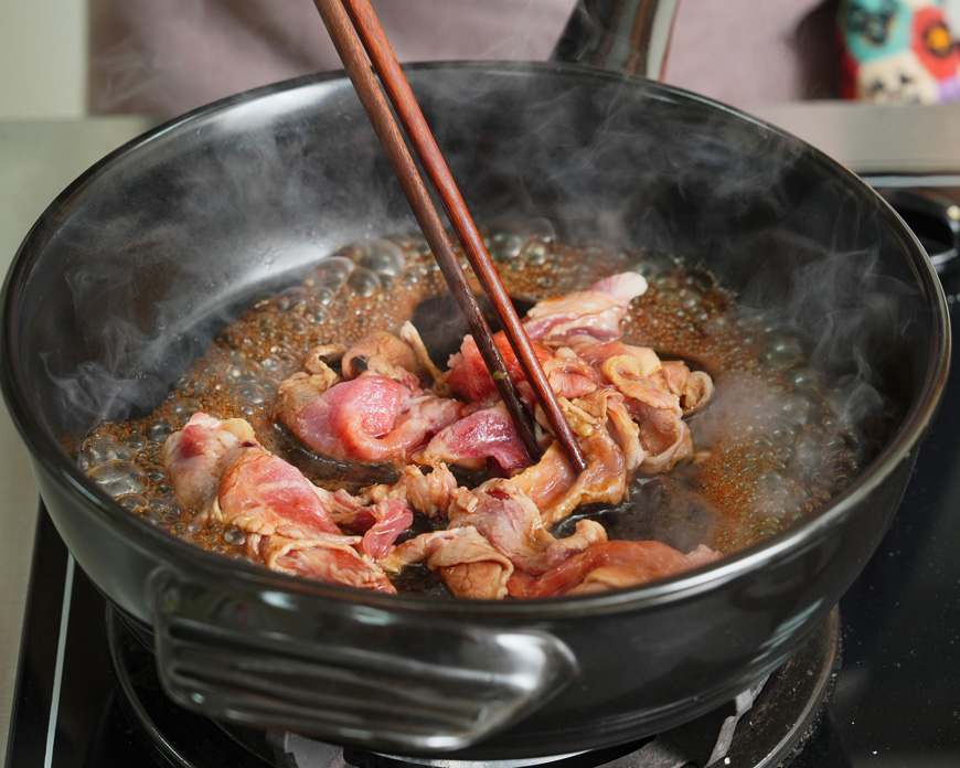 2. 取一鍋子放油適量,加入豬肉拌炒,待豬肉變色,便可以分次少量加入降溫後的關東式壽喜燒醬汁,稍微將肉再炒至焦糖化。 |