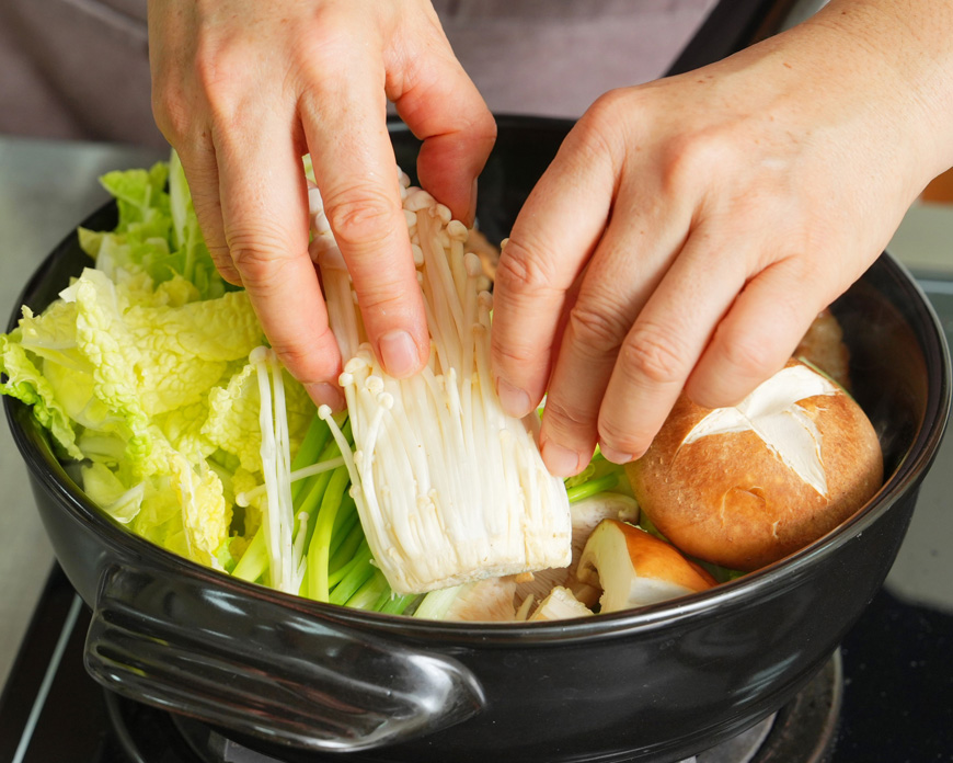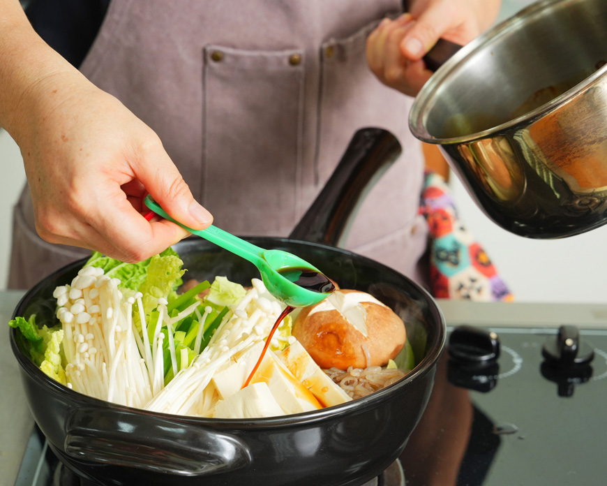 4. 若味道不夠,再添加醬汁調味,依照個人口味調整濃淡。確認蔬菜和肉都煮熟後,便可以開始享用;一邊吃一邊再加蔬菜、加醬汁。 |