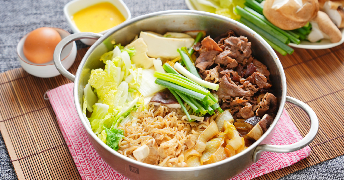 4. 食材都放入後,就可以從肉開始吃,也可搭配已經煮熟的蔬菜食用,洋蔥越熟越好吃喔!享用時,邊吃邊重複步驟1調配醬汁,並持續加入蔬菜、菇類、豆腐等來補充鍋內水分。 |