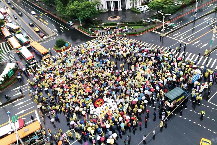 ▲2014年308廢核遊行北部場,隊伍行經忠孝東路與中山北路十字路口,以短暫二十分鐘的占領行動,警告政府未來如果持續濫權打壓反核,未來將以更多「公民不核作」的行動反抗,絕不束手妥協。(圖/黃宏錡)